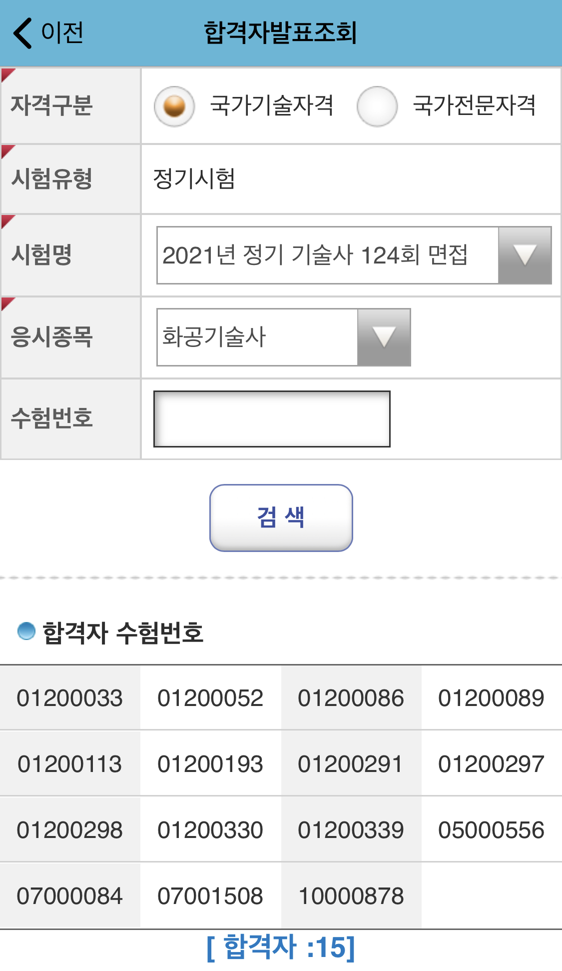 124회 화공기술사 합격자 최종발표조회를 해보았습니다.