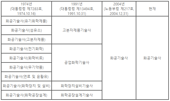 지금의 화공기술사는 공업화학기술사, 화학장치설비기술사, 화학공장설계기술사, 고분자제품기술사가