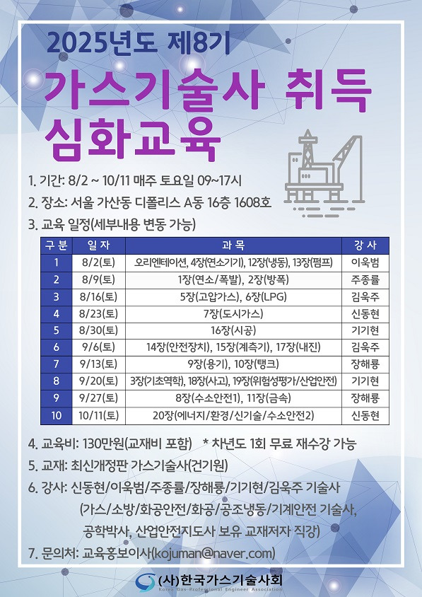 안녕하세요. 기술사 찰스입니다. 한국가스기술사회에서 2025년 제8기 가스기술사 취득 심화교육을 개최합니다. 가스기술사 자격증 취득을 목표로 하시는 분들을 위한 전문 교육과정으로, 체계적이고 실무 중심의 교육을 제공합니다.